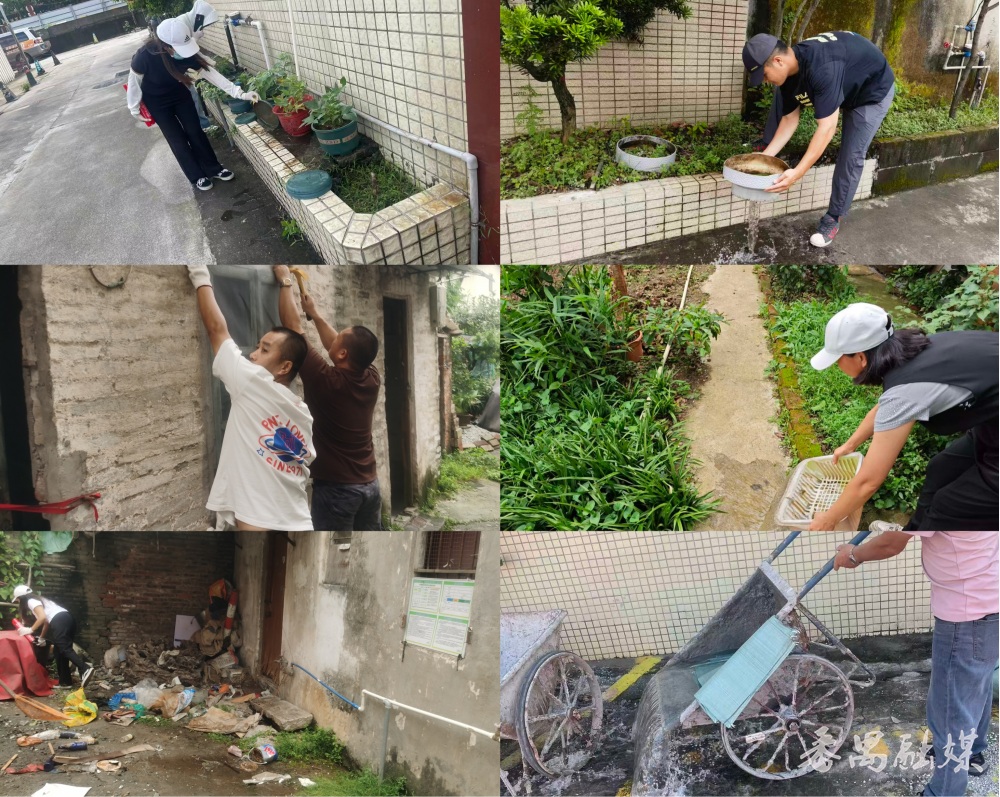 行动中,各村(社区)对辖区开展“拉网式”积水隐患排查与清理,重点覆盖居民小区、沿街商铺、农贸市场等重点区域,重点针对小区绿化带、楼顶平台、景观池、菜地等公共区域进行翻盆倒罐,对主次干道、背街小巷、房前屋后沟渠、天台排水槽等进行清淤疏堵,保持水流畅通,防止蚊媒孳生。